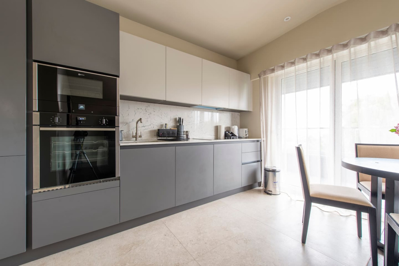 - Amenities: Internet, Wireless, Kitchen, Washing Machine, Dryer, Elevator, Hair Dryer, Heating, Smoke detector, Carbon Monoxide Detector, Fire Extinguisher, Essentials, Shampoo, Hangers, Iron, Laptop Friendly workspace, TV, Free parking, Balcony, Suitable for children, Suitable for infants, Linens, Toaster, Dishwasher, Microwave, Oven, Electric kettle, Tub, Stove, Refrigerator, Garden or backyard, Kitchen utensils, Single level home, Hot water, Private entrance, Extra pillows and blankets, Cooking basics, Room darkening shades, Paid parking on premises, Long term stays allowed, Cleaning before checkout, Dining table, Cleaning products, Body soap, Conditioner, Shower gel, Clothing storage, Drying rack for clothing, Portable fans, Coffee, Freezer, Wine glasses