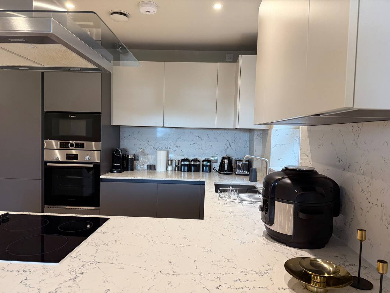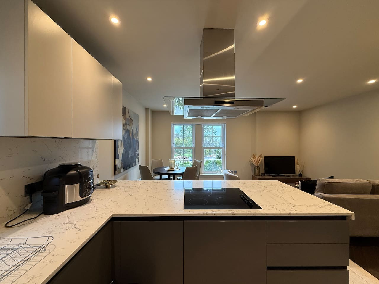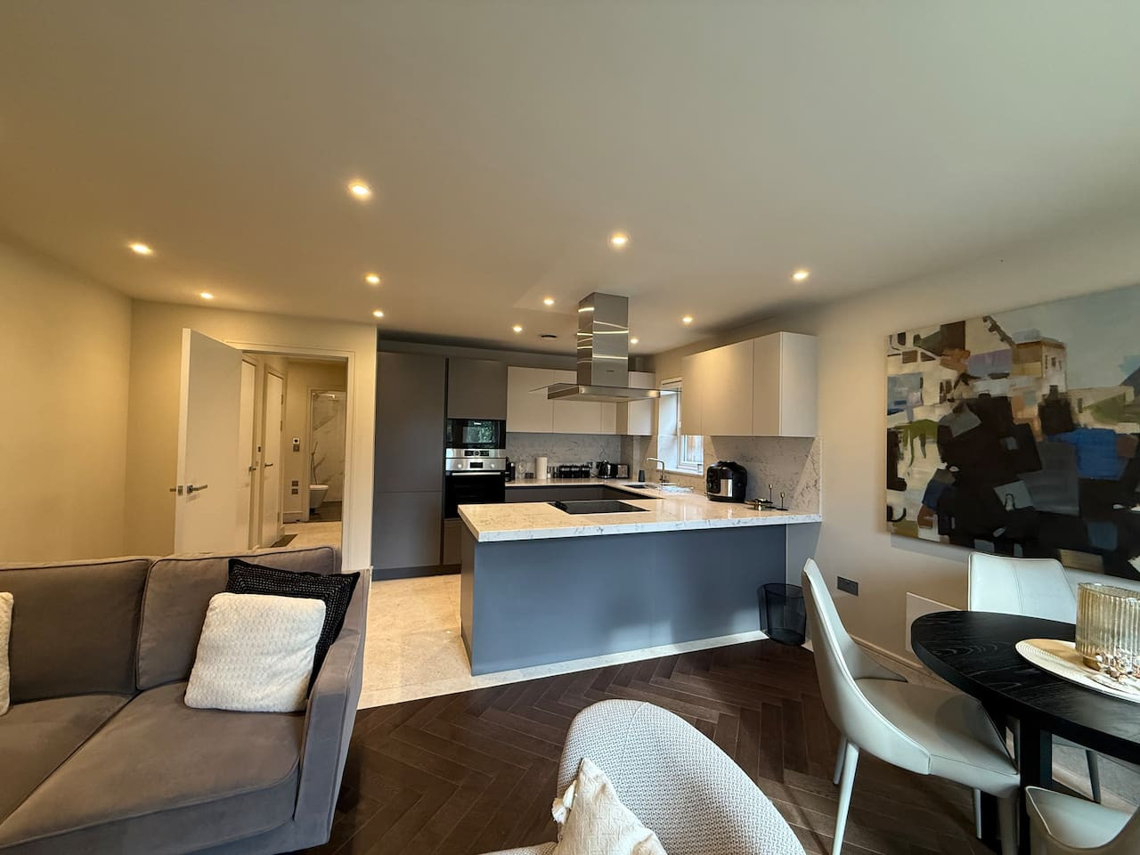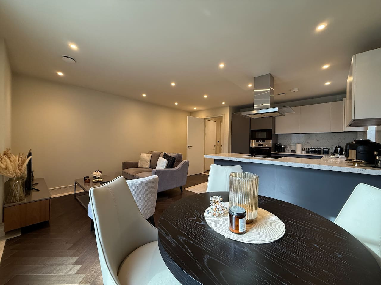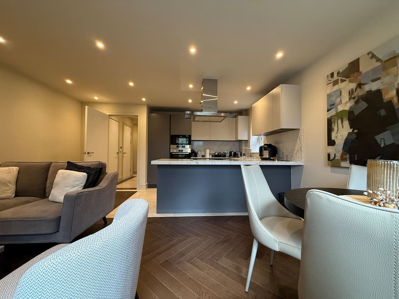Experience contemporary comfort in this stylish 1-bedroom, 1-bathroom apartment. The open-plan living area features a cozy sofa and lounge space, perfect for relaxing or entertaining. The sleek kitchen is fully equipped with high-end appliances, a marble-effect countertop, and all the essentials for cooking and dining.