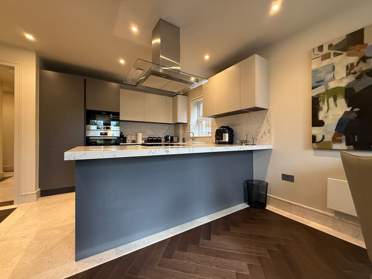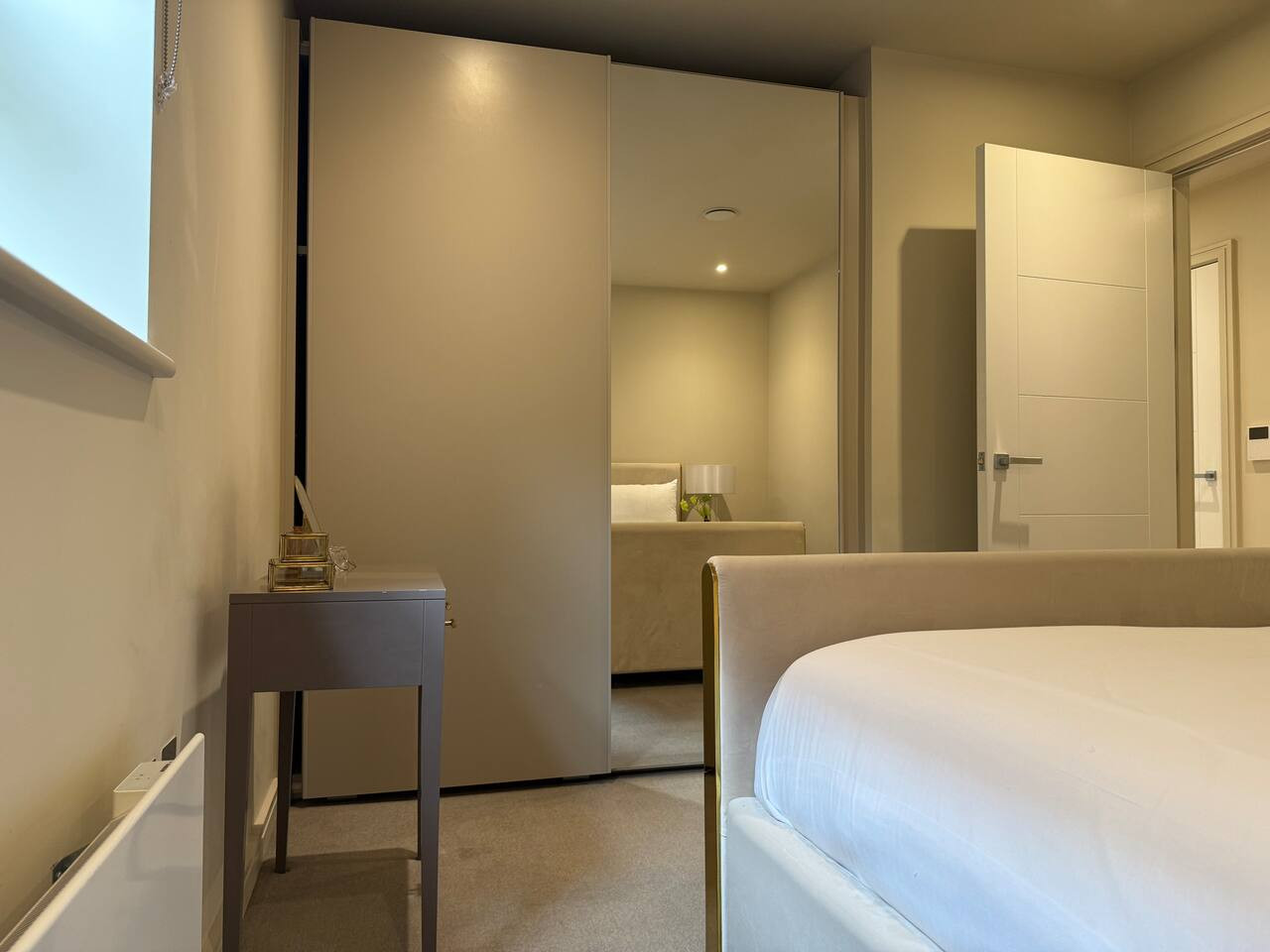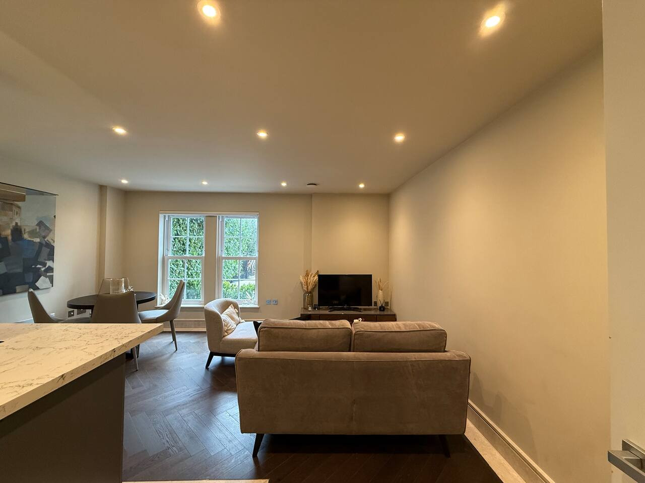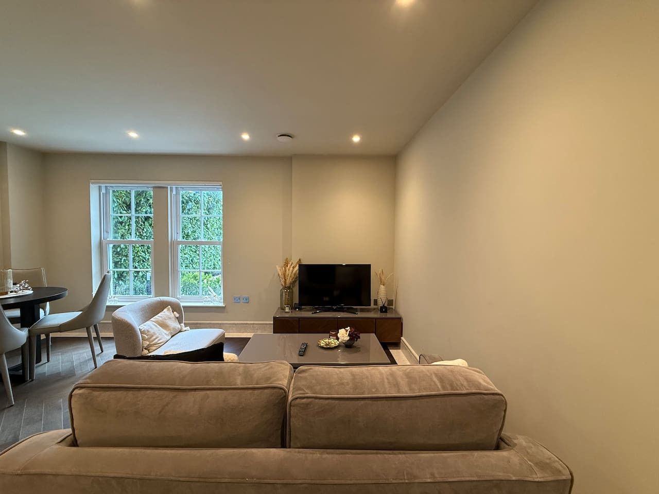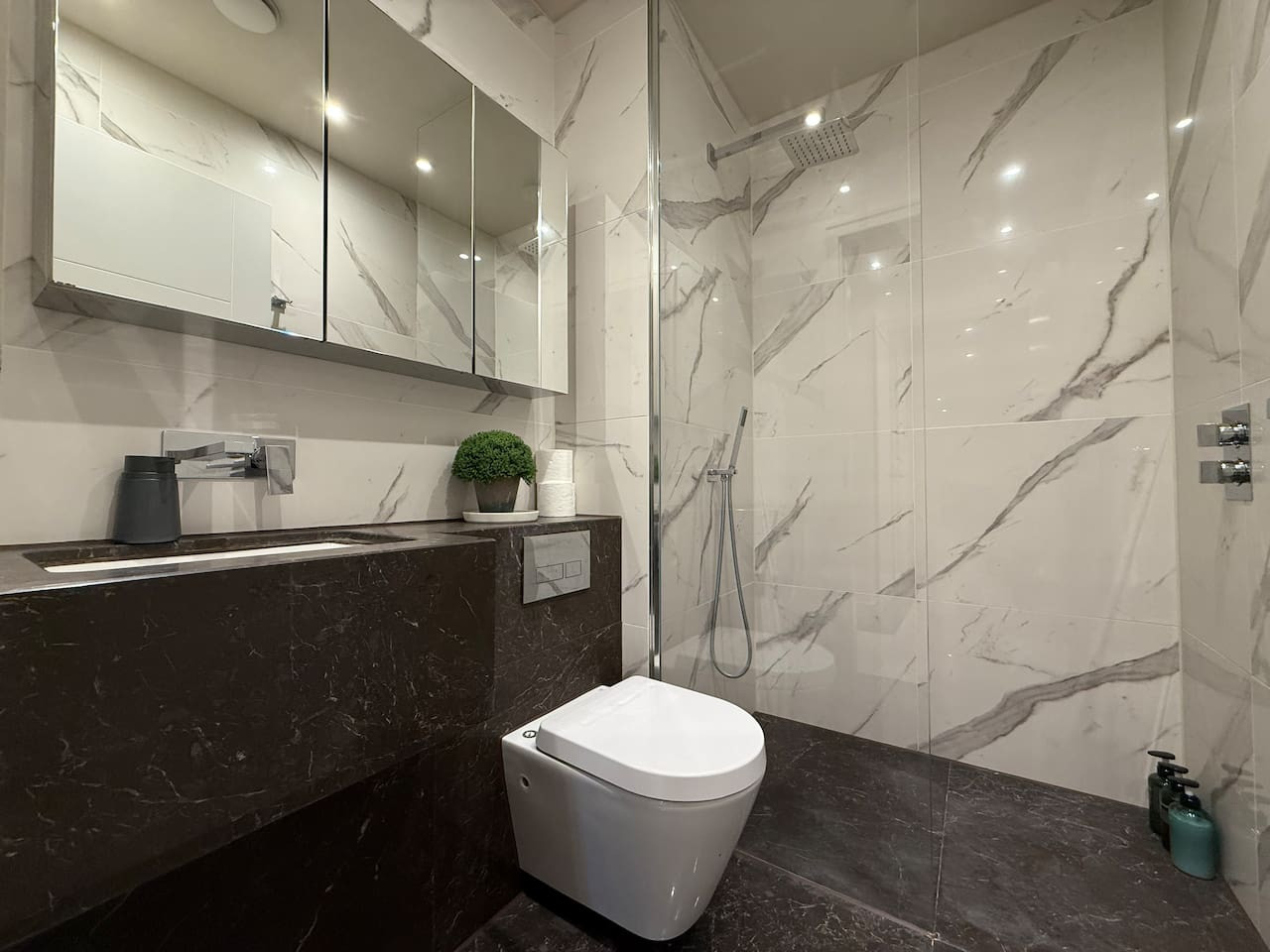 Experience contemporary comfort in this stylish 1-bedroom, 1-bathroom apartment. The open-plan living area features a cozy sofa and lounge space, perfect for relaxing or entertaining. The sleek kitchen is fully equipped with high-end appliances, a marble-effect countertop, and all the essentials for cooking and dining.