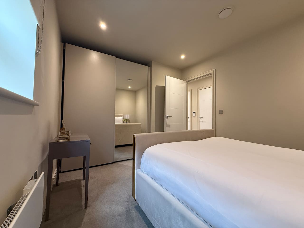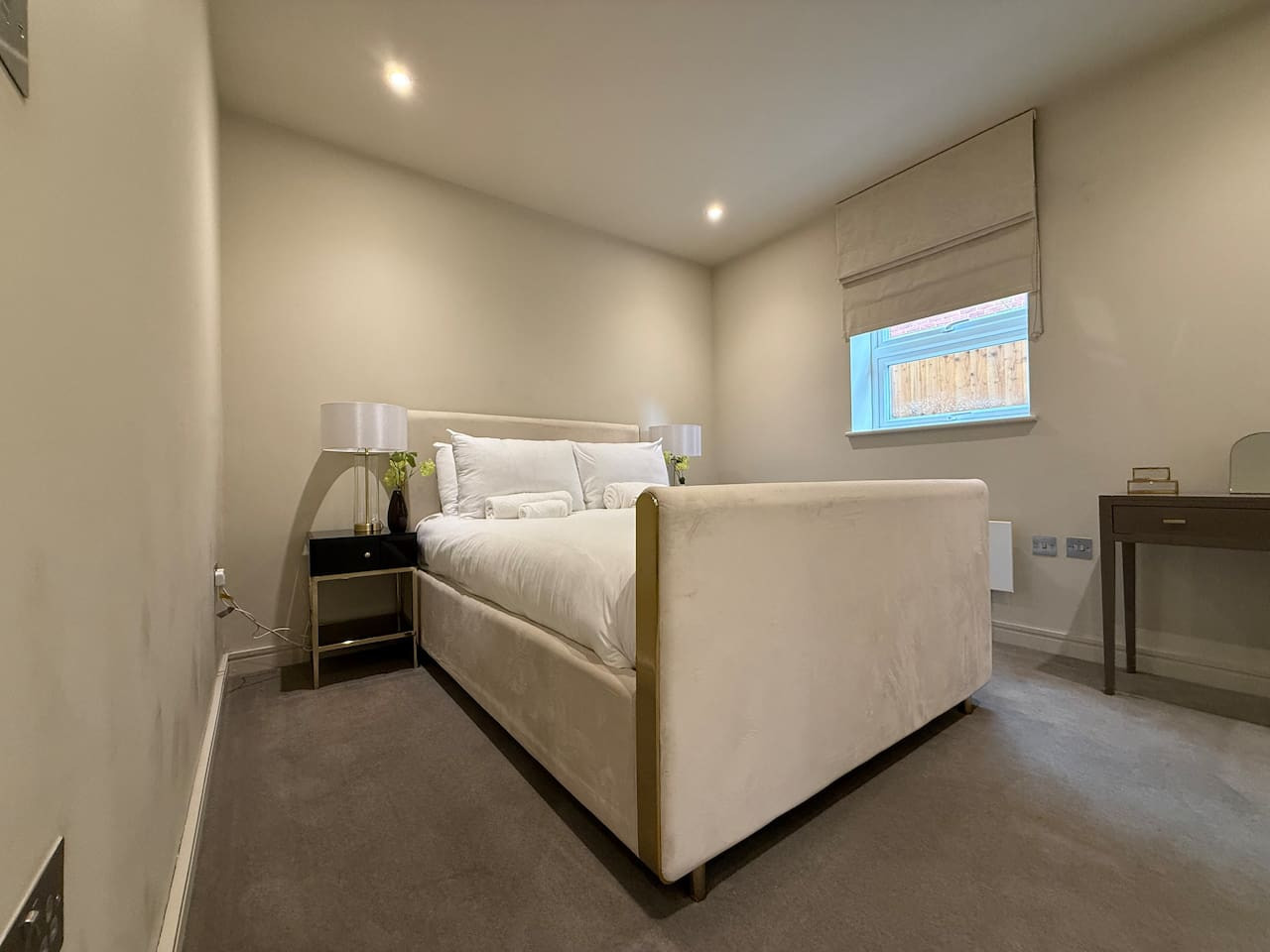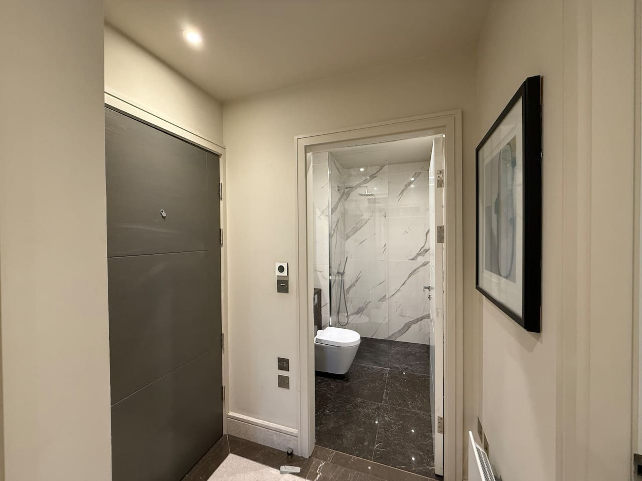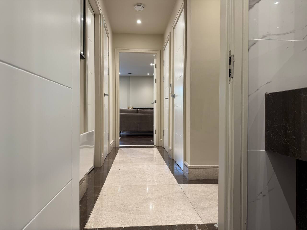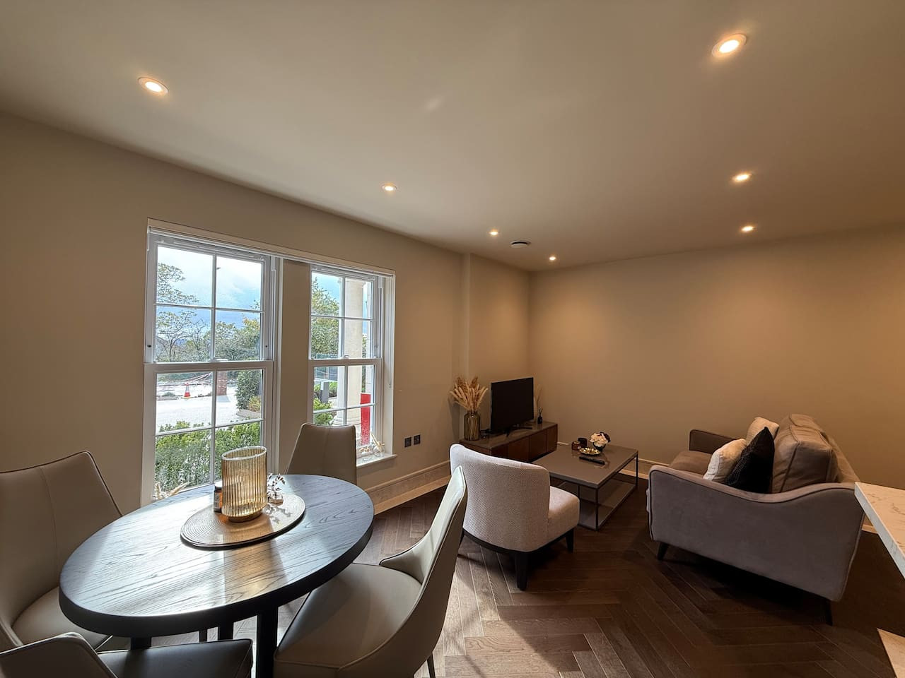 Experience contemporary comfort in this stylish 1-bedroom, 1-bathroom apartment. The open-plan living area features a cozy sofa and lounge space, perfect for relaxing or entertaining. The sleek kitchen is fully equipped with high-end appliances, a marble-effect countertop, and all the essentials for cooking and dining.